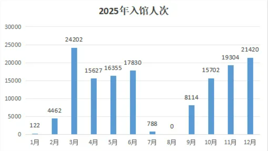 2025年图书馆全年入馆读者143926人次,开馆时间265天(3013小时)。