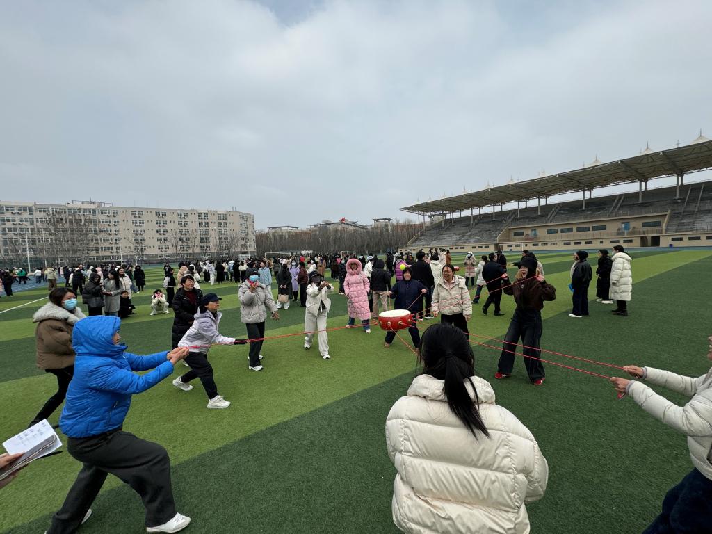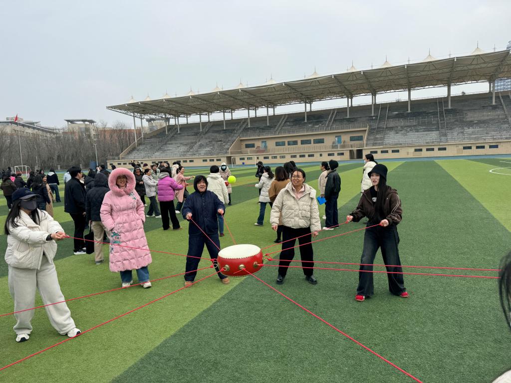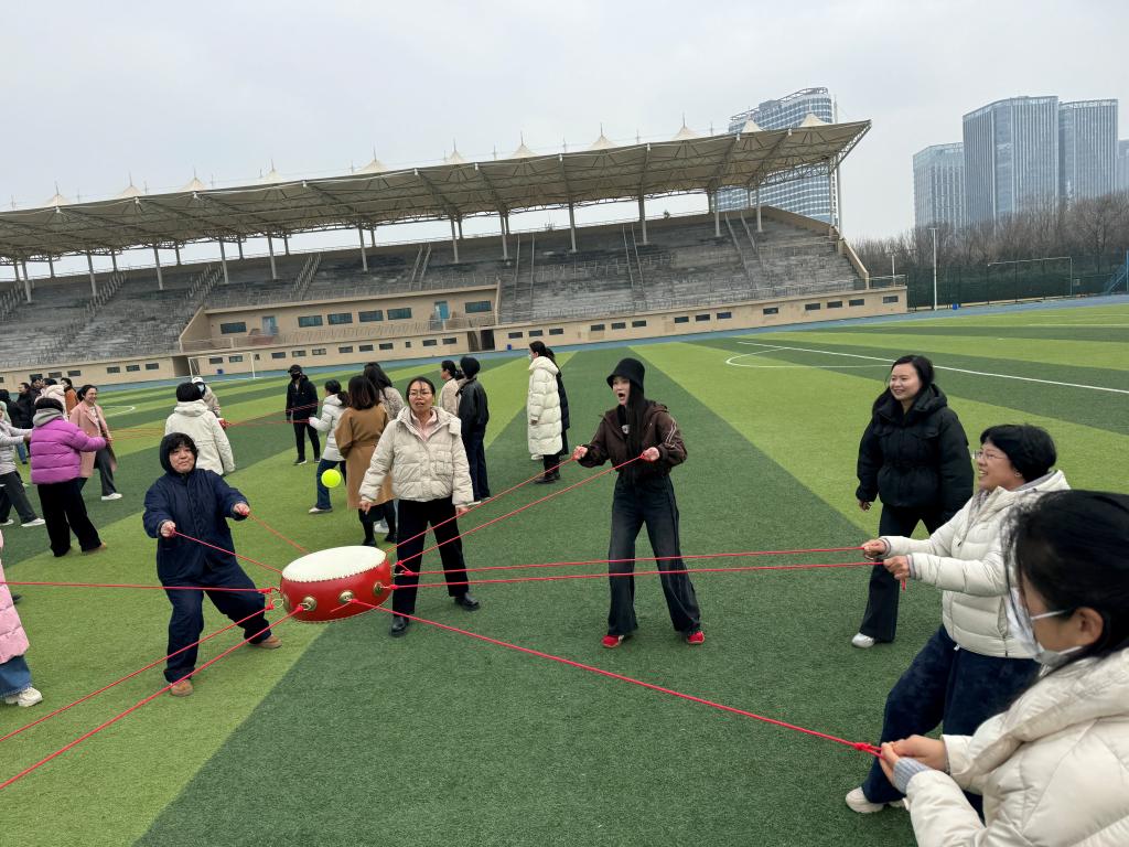 活动以同心鼓颠球为核心项目,图书馆女职工自发组成3队、默契配合。活动现场,队员们围鼓而立,各执一绳,目光紧随鼓面小球,在一次次尝试中摸索节奏、调整力度,从最初的手忙脚乱到逐渐的步调一致,“稳住、慢一点、齐发力”的鼓劲声此起彼伏。